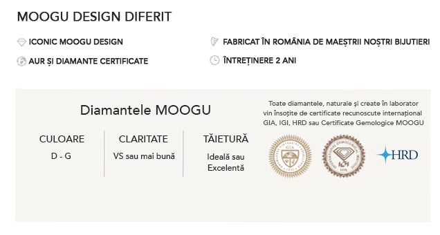 Toate diamantele folosite în bijuteriile MOOGU sunt atent selectate, certificate și aduse din Antwerp. Diamantele mai mari de 0,20 ct (4 mm) sunt însoțite de certificat GIA, HRD sau IGI, în funcție de preferința clientului.